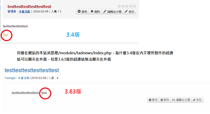 我在使用tadnews的時候發現,在首頁的/modules/tadnews/index.php的消息列表裡,為什麼3.4版在內文裡所製作的超連結,於消息列表裡可以顯示,但是3.63版的超連結無法顯示在外面的消息列表裡(如下圖)。