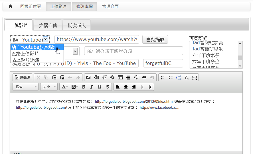 - 加入Youtube連結時,會自動抓取標題、作者以及依設定之寬度來自動判斷影片最佳高度。