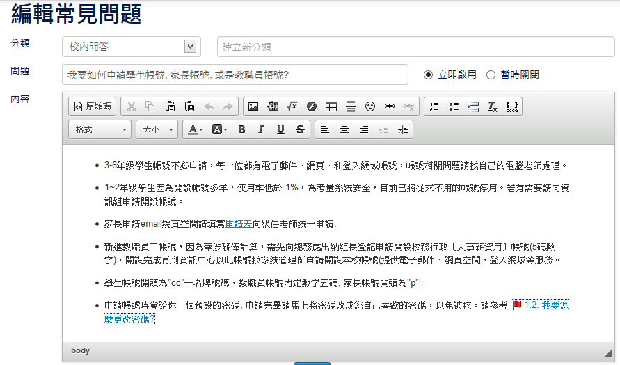 由於釋出模組時,有些問題會一再被問到,因此,很需要一個FAQ模組來整理一下常見問題,然而,目前XOOPS現有的FAQ模組中,介面稍嫌複雜了點,因此,做了一個算是小巧精緻可以直覺操作的FAQ模組來給自己用用~