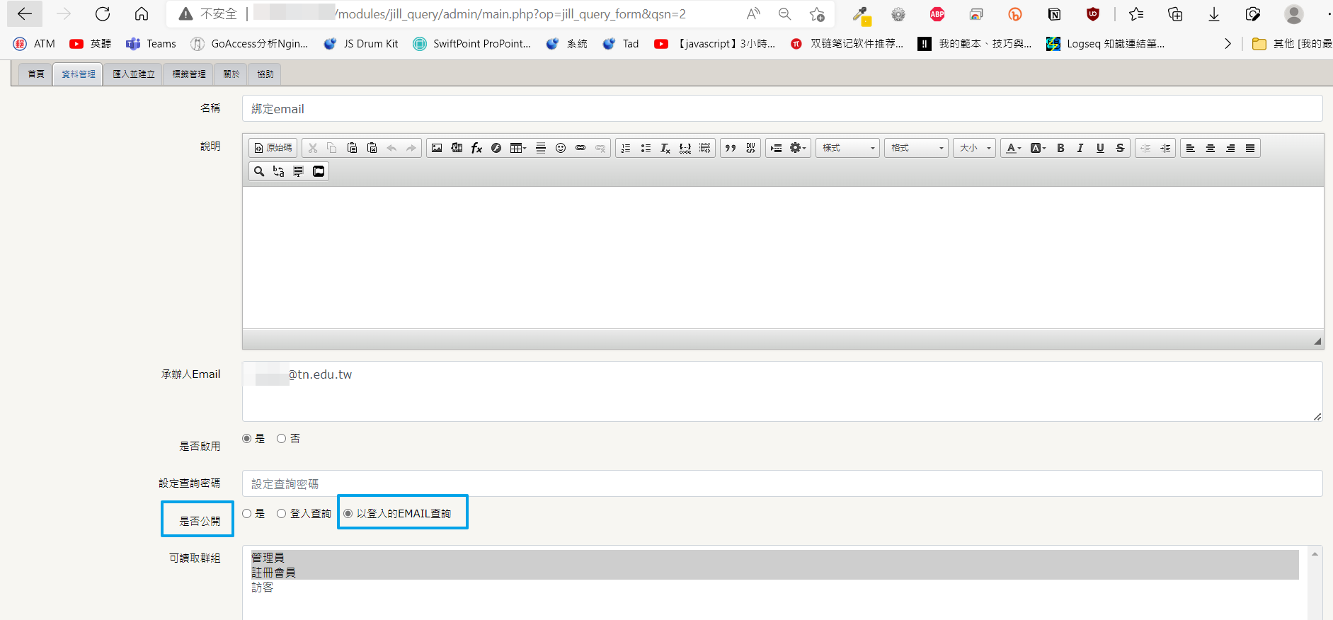 警告:本模組不建議放有個資的紀錄,如:身分證字號、出生年月日、電話.......等敏感欄位。若權限或搜尋條件設置不當,都將導致個資外洩。