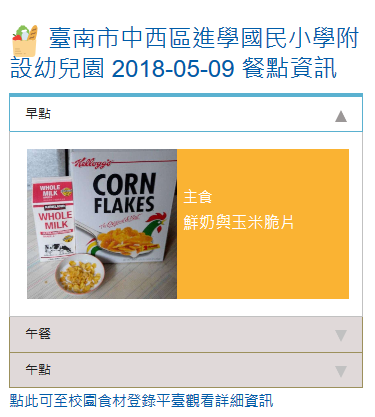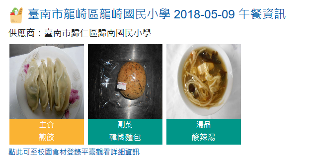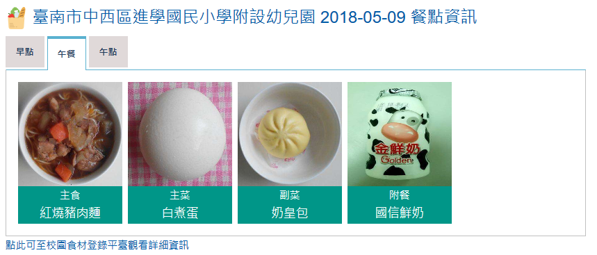 本模組可以直接從校園食材登錄平臺擷取午餐資訊,讓老師無須再一次輸入各種營養午餐資料。支援多校(如學校和附幼)、多供應商(一間學校多個供應商)、多餐(如幼兒園還有點心),全部只須到偏好設定設定學校編號即可。
